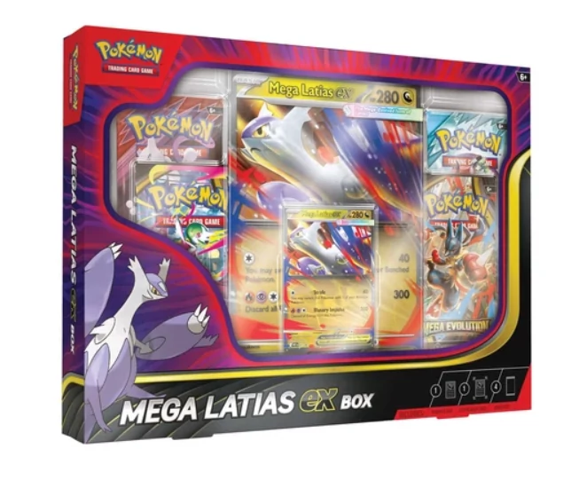 A Mega Latias ex Box hivatalos tartalma: 1 db fóliás Mega Latias ex promókártya, 1 db oversize (lentikuláris) Mega Latias ex jumbo kártya és 4 db Pokémon TCG booster pack. Látványos megjelenés, erős gyűjtői vonzerő, sealed formátum.