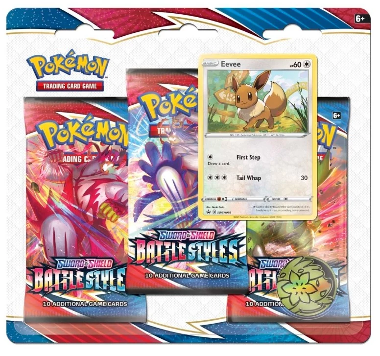 A Pokémon Battle Styles: Eevee 3-Pack Blister ideális választás mindenkinek, aki szeretné bővíteni gyűjteményét vagy ritka húzásokra vadászik. A csomag három Battle Styles booster csomagot és egy exkluzív, holografikus Eevee promókártyát tartalmaz.