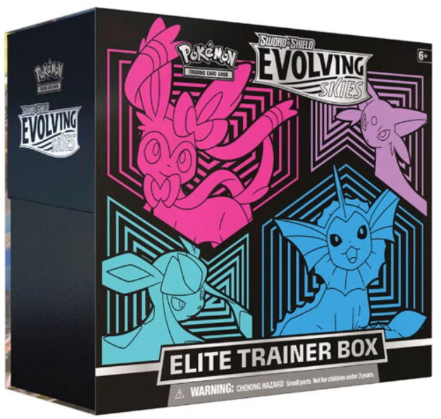 A Pokémon TCG Evolving Skies Elite Trainer Box a Sword & Shield korszak egyik legkeresettebb és legismertebb szettje, amely az Eeveelution Pokémonokra és Dragon típusokra épül.